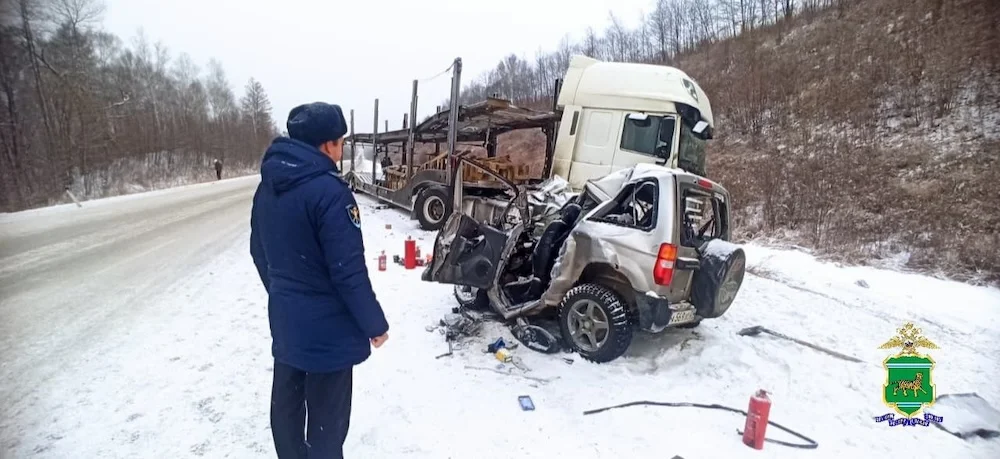 На федеральной автодороге «Амур» около поселка Кимкан Облученского района произошло лобовое столкновение двух автомобилей. Предварительно установлено, со слов водителя автовоза, автомобиль «Мицубиси Паджеро» допустил выезд на полосу встречного движения. В результате столкновения автомобиль загорелся, от полученных травм на месте скончались водитель 1993 г.р. и женщина 1999 г.р., находящиеся в легковой машине.