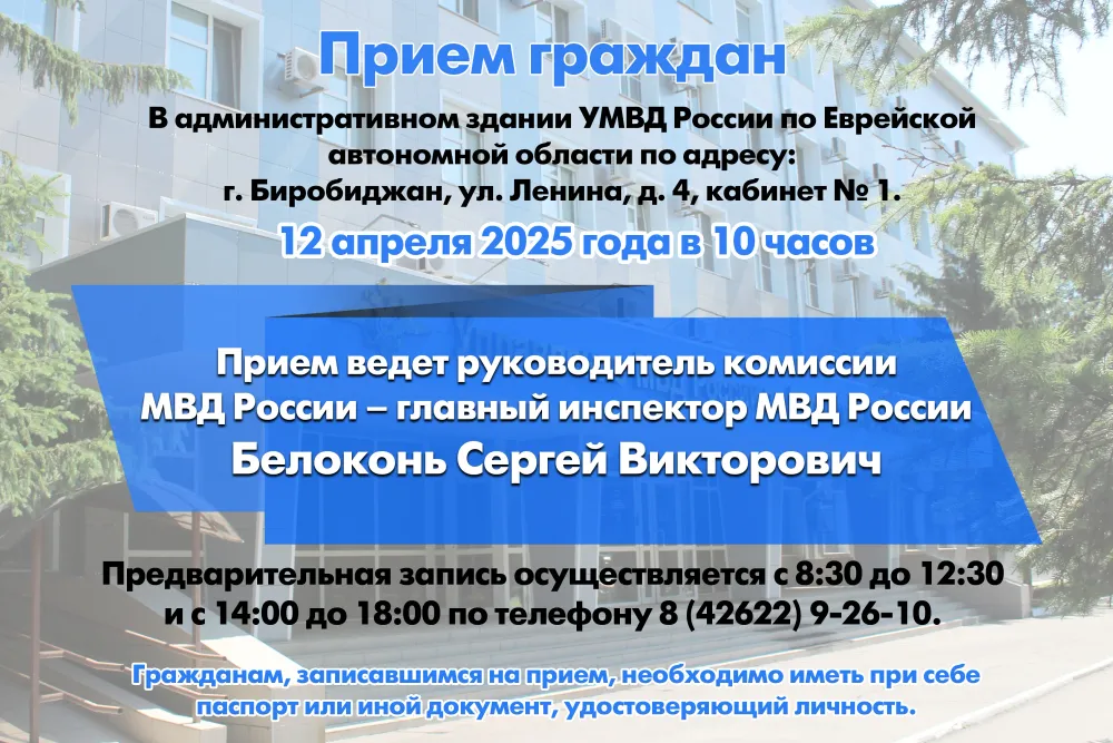 Руководитель комиссии МВД России – главный инспектор МВД России Белоконь Сергей Викторович – проведет личный прием граждан 12 апреля 2025 года в 10:00 в административном здании УМВД России по Еврейской автономной области, расположенном по адресу: г. Биробиджан, ул. Ленина, д. 4, кабинет № 1.