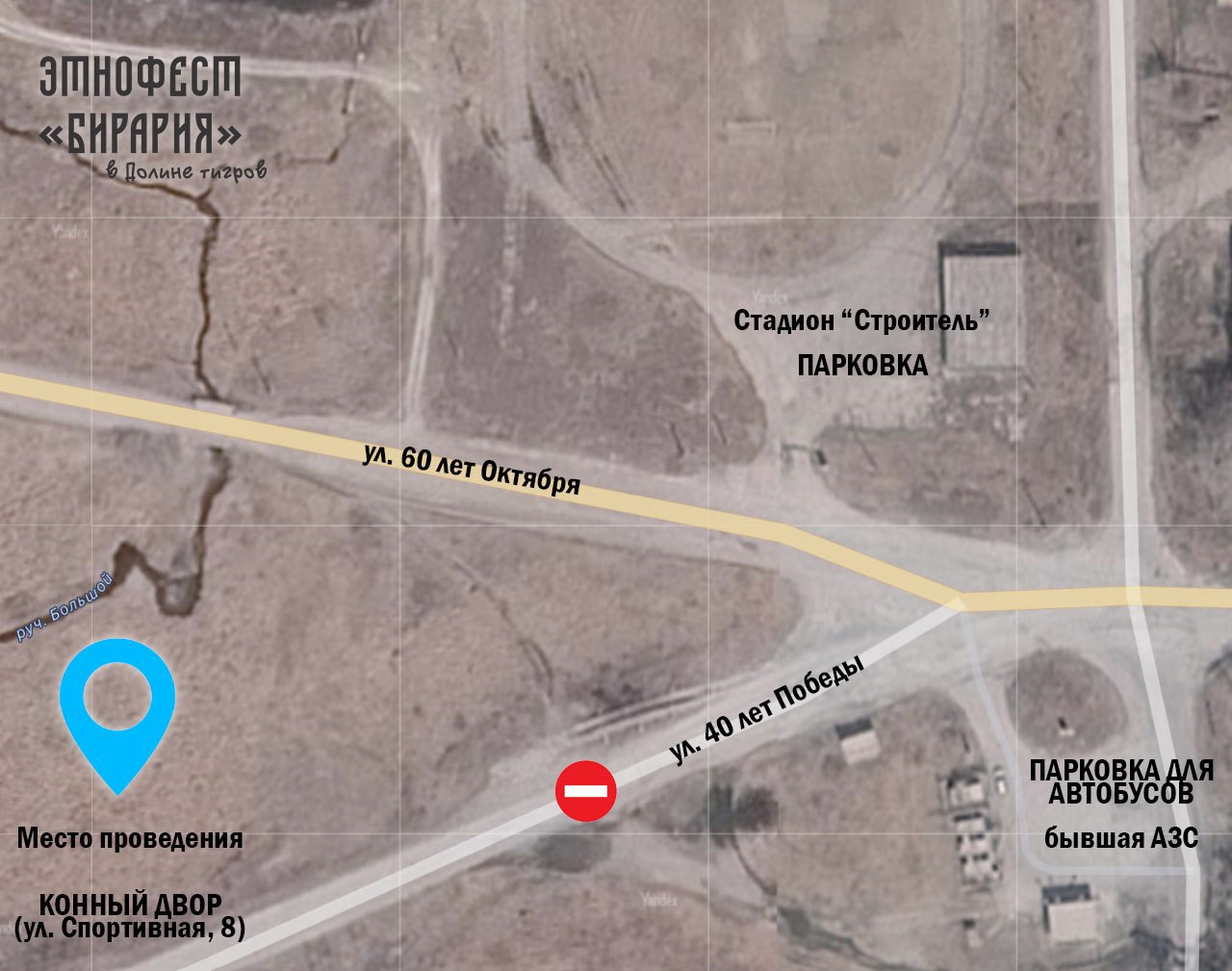 Место проведения — п. Теплоозерск, ул. Спортивная, 8. При настройки навигатора выбирайте маршрут до АЗС Теплоозерска, а уже после — площадку фестиваля. Иначе навигатор поведет вас по сложному маршруту. Организованная парковка авто будет на стадионе «Строитель» на ул. 60 лет Октября — напротив школы верховой езды.