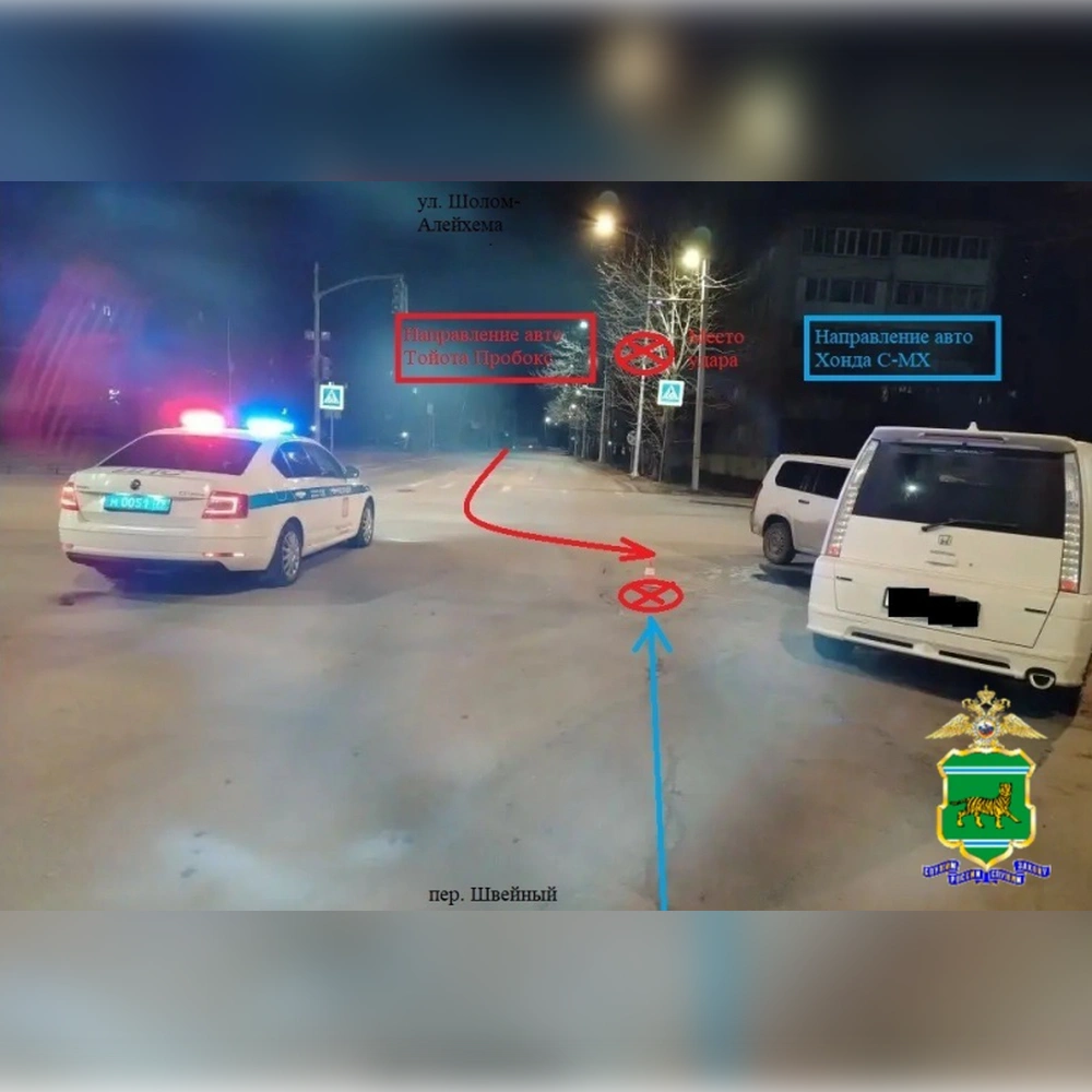 25 апреля на перекрестке улицы Шолом-Алейхема и переулка Швейный в Биробиджане водитель автомобиля «Тойота Пробокс» при повороте налево на разрешающий зеленый сигнал светофора не предоставил преимущество и столкнулся с автомобилем «Хонда С-МХ», двигавшимся во встречном направлении прямо. Водитель и пассажир автомобиля «Хонда С-МХ» получили телесные повреждения.