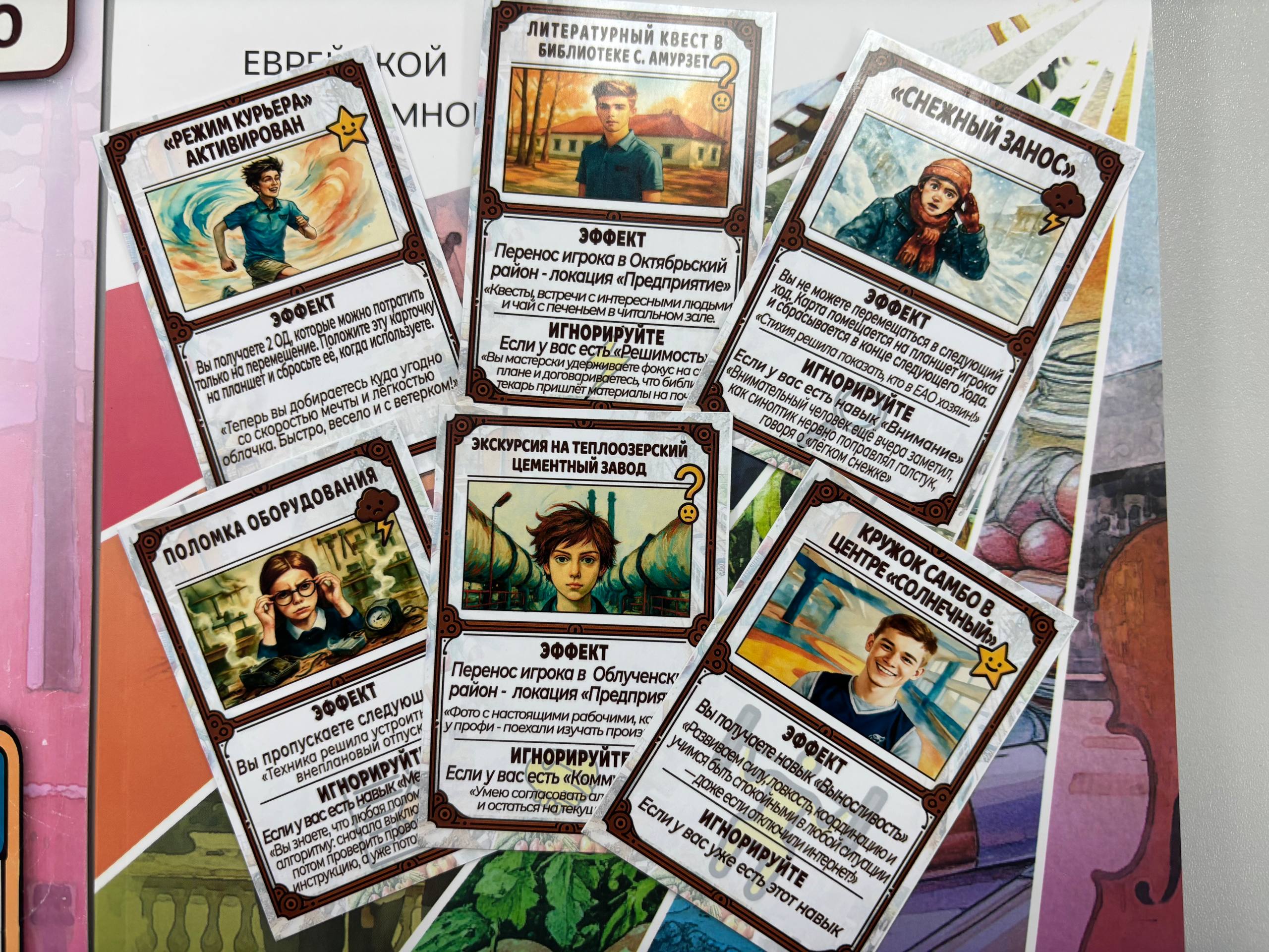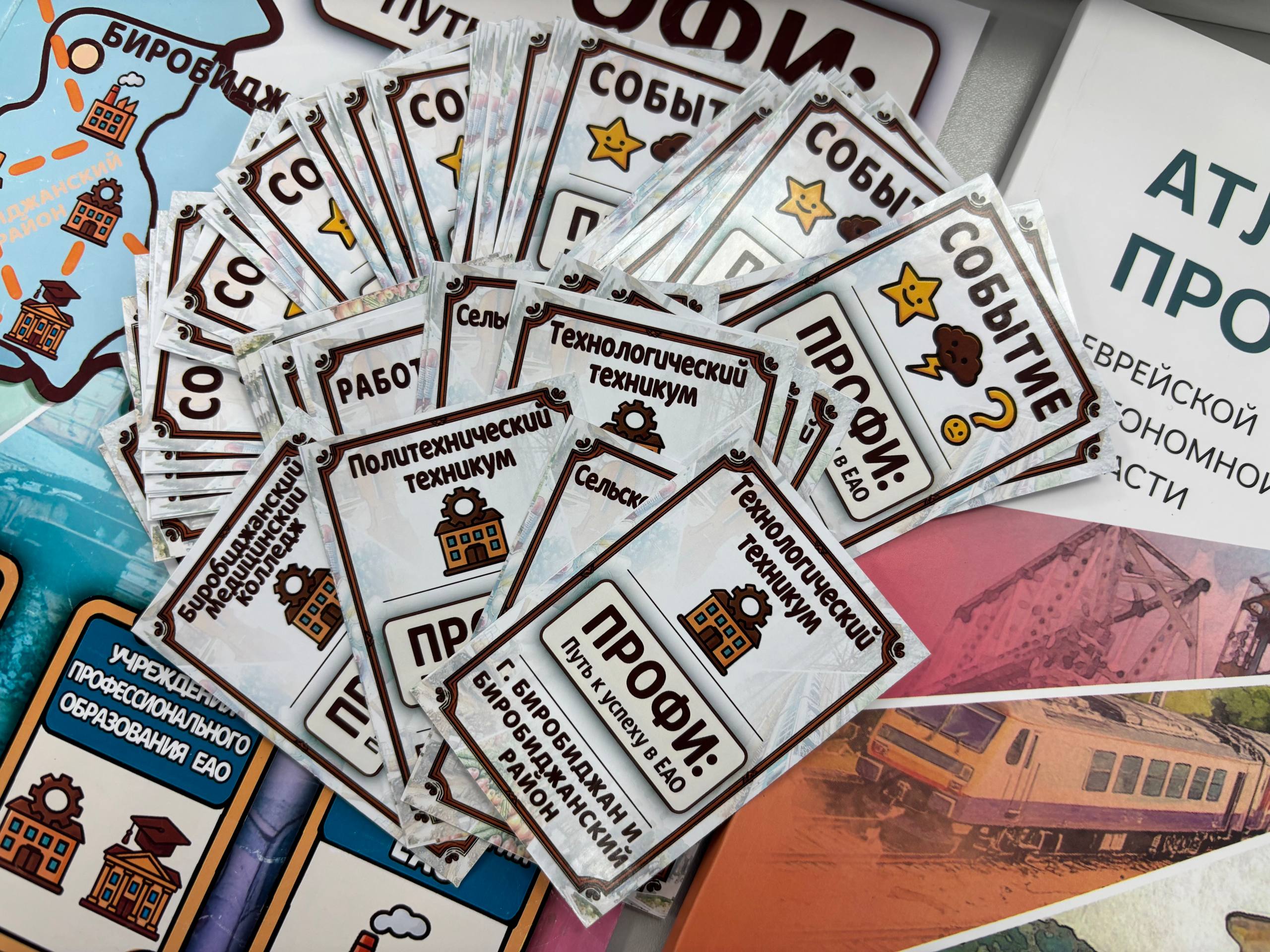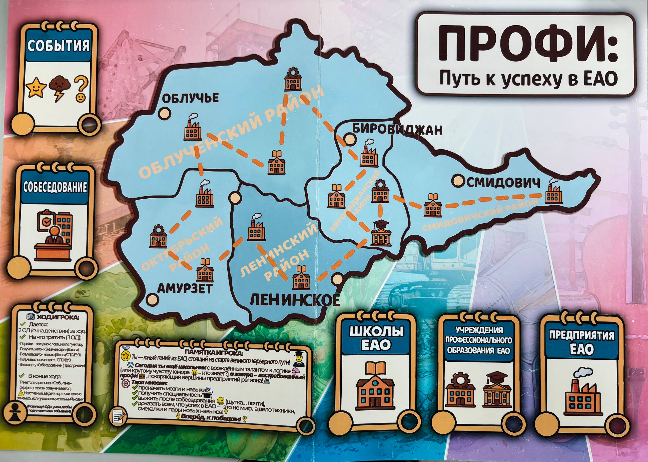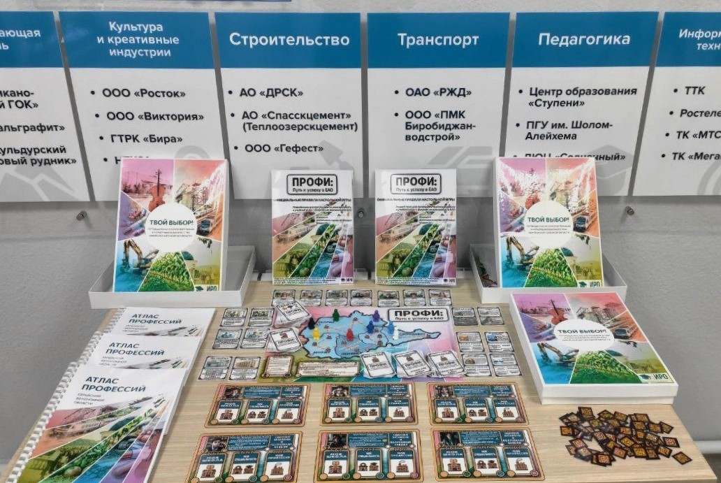 Ролевая стратегическая настольная игра «ПРОФИ: путь к успеху в ЕАО» – это интерактив для школьников 7-11 классов. На примере одного из 12 персонажей игроки стартуют в школах ЕАО, копят базовые навыки, затем выбирают СПО или ВУЗ, осваивают специальность и выходят на предприятия региона. По пути – задания, события, стажировки и «собеседование» на финише.