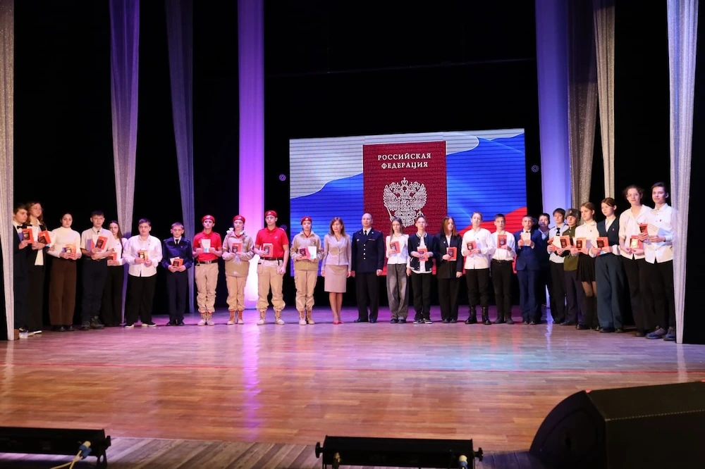 После исполнения Государственного гимна РФ самый главный документ россиянина по поручению мэра областного центра Алексея Кузьмина из рук заместителя главы мэрии города по социальным вопросам, образованию и культуре Натальи Еременко получили 24 обучающихся общеобразовательных учреждений областного центра, которым исполнилось 14 лет.