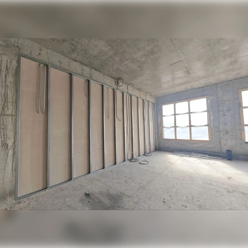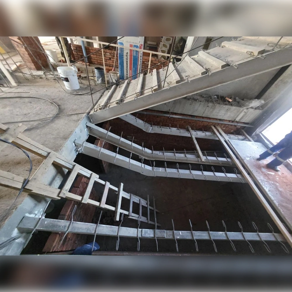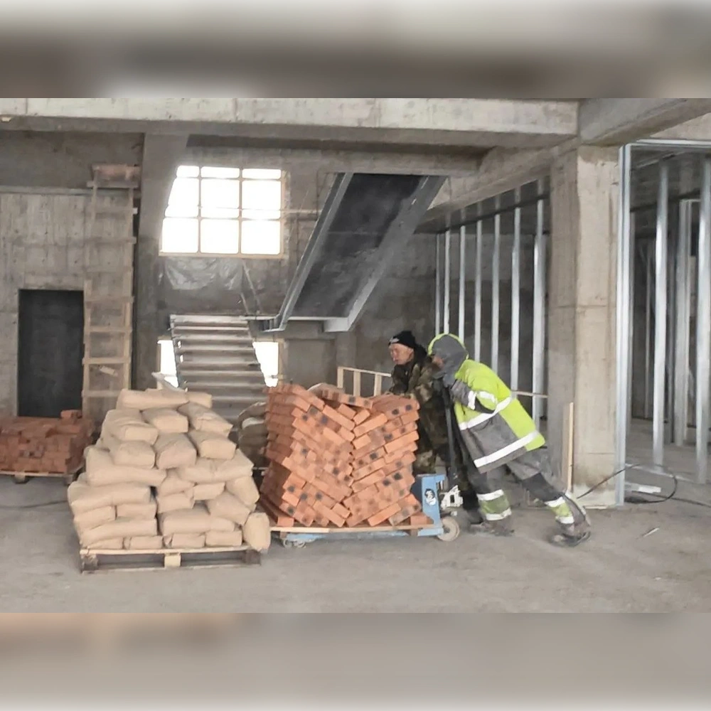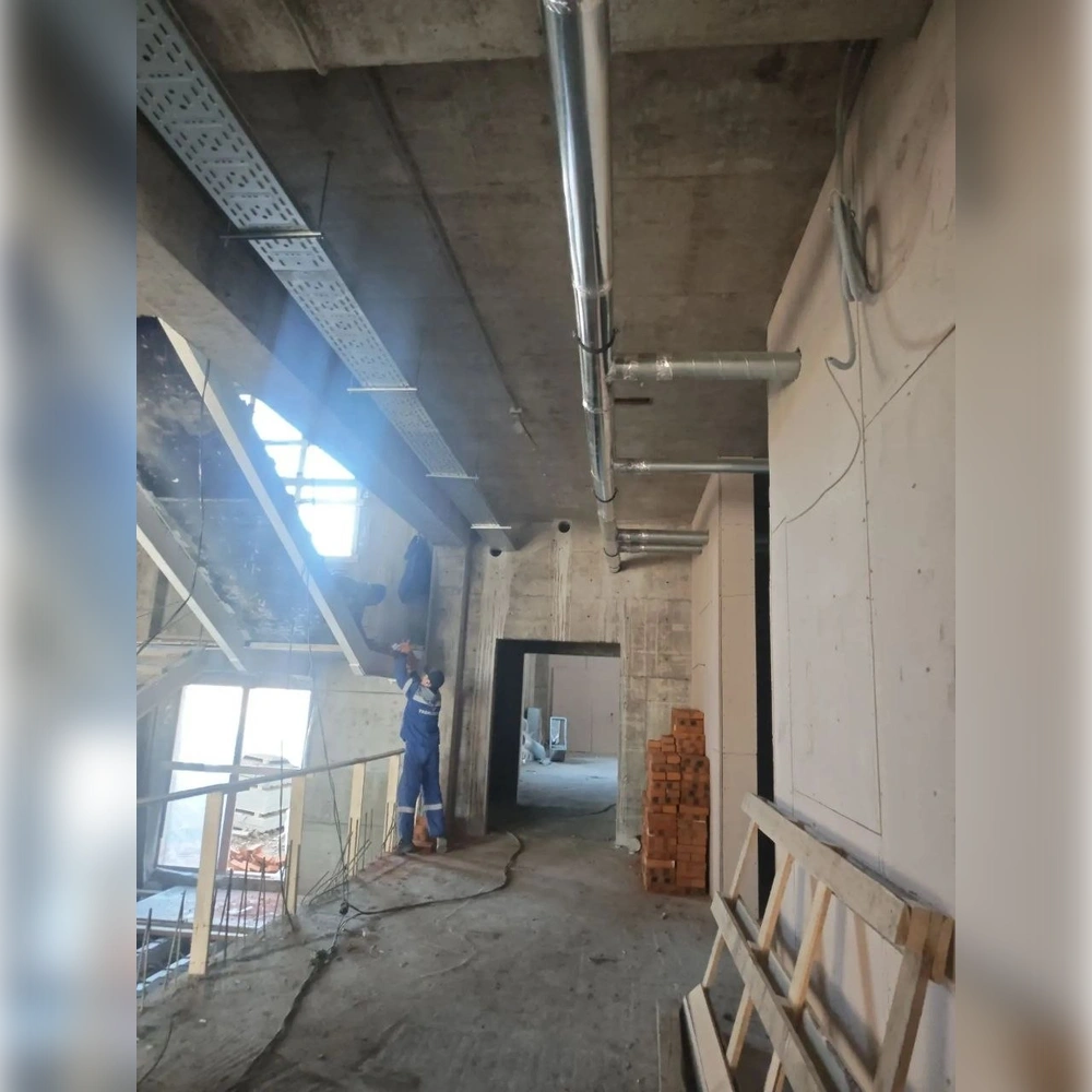 На первых двух этажах выполнено зонирование, сейчас такие же работы идут на третьем. Параллельно рабочие ведут монтаж лифта, систем отопления, электроснабжения и вентиляции.