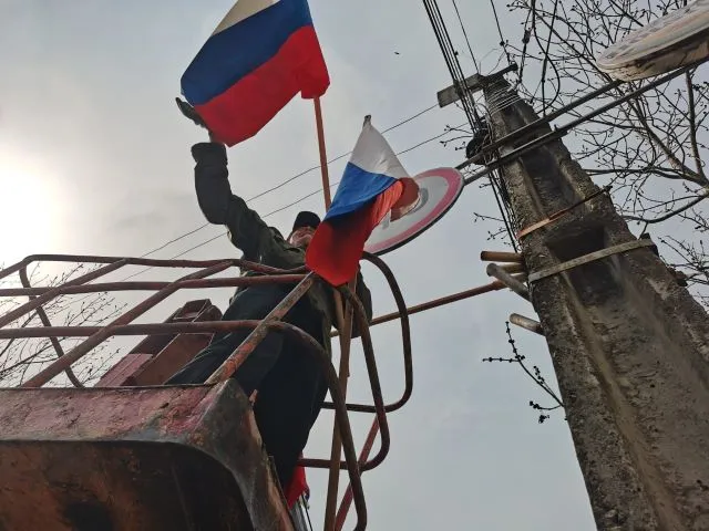 В Биробиджане работники ООО «Чистый город» приступили к украшению городских улиц. В Сквере Победы рабочие меняют старые баннеры на новые, передает LIVE Биробиджан.