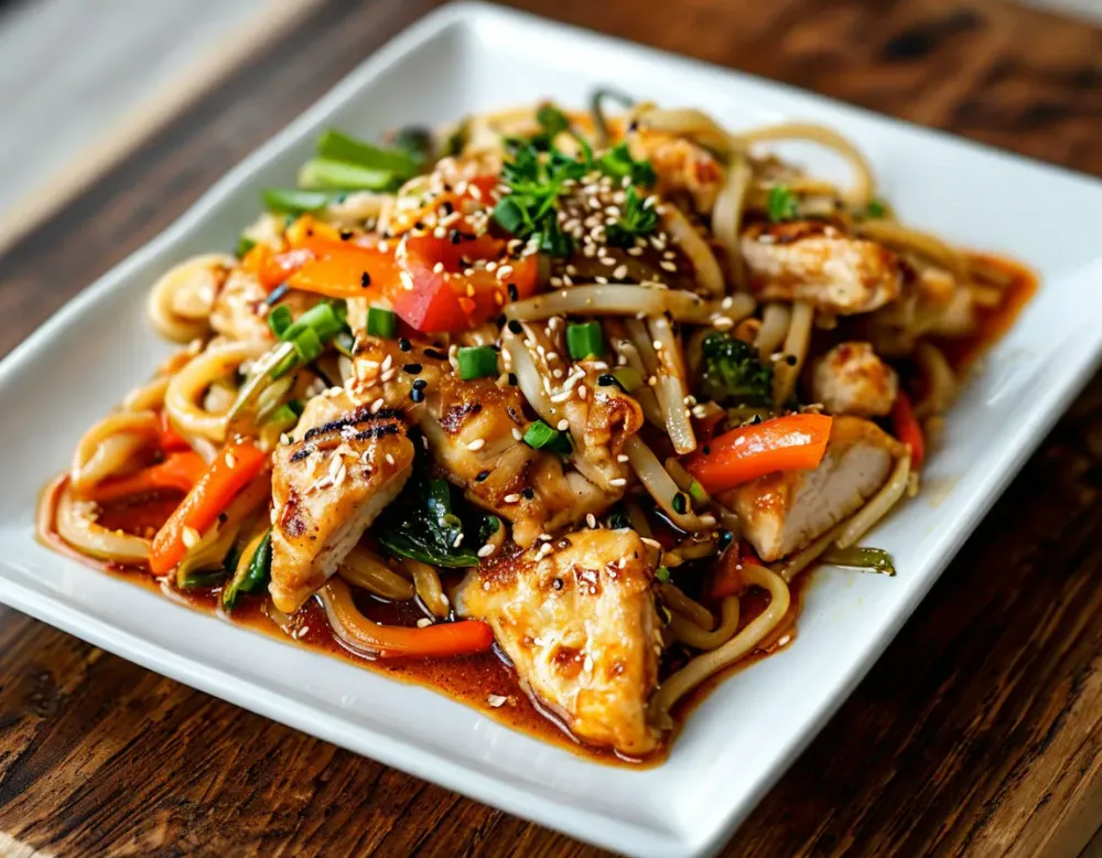 лапша удон – 1/3 упаковки;филе курицы – 1 грудка;морковь – 1 небольшая;болгарский перец – 1 шт.;цукини – 1 небольшой;стручковая фасоль (замороженная) – 100 гр;соевый соус – 40 мл;соус терияки – 1 ст. ложка;вода – 150 мл;семена кунжута – 1 ст. ложка.