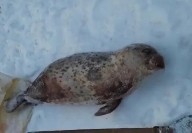 Видео с молодой ларгой (Phoca largha) опубликовали рыбаки из Хабаровска. Ее замерзшее тело было обнаруженно 28 февраля в устье р. Тунгуска.