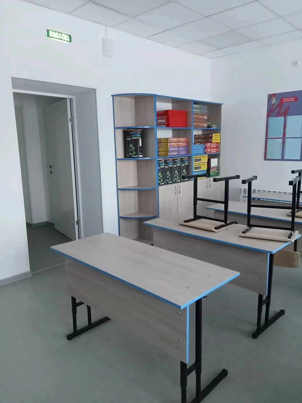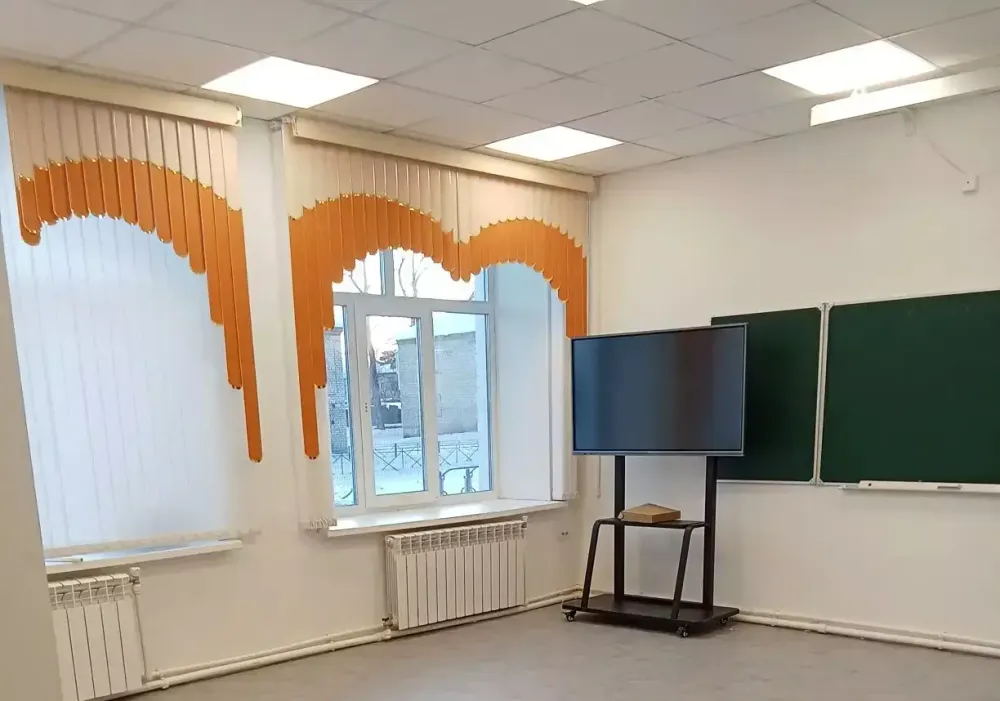 В ходе работ проведён комплексный ремонт помещений: выровнены стены, уложено современное напольное покрытие, установлена новая мебель, школьные доски и специализированное оборудование для учебных классов.