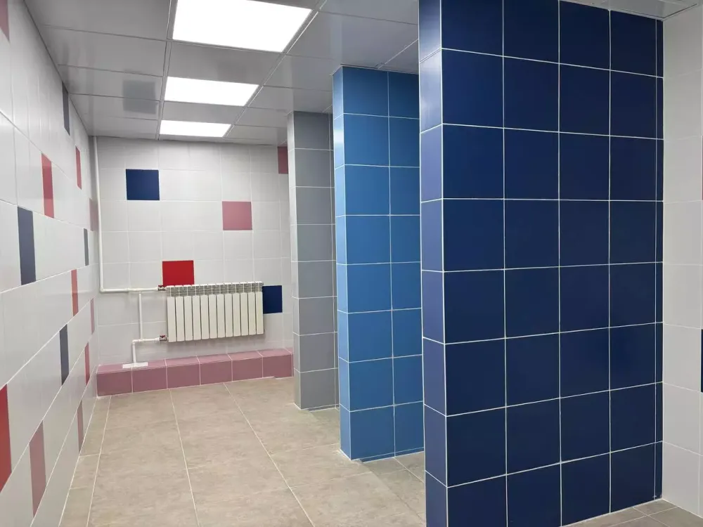 На втором этаже здания полностью заменили окна на новые стеклопакеты. Завершили ремонт в малой душевой на 3 кабинки. Впереди — реконструкция ещё одной малой и большой душевой на 10 кабинок.